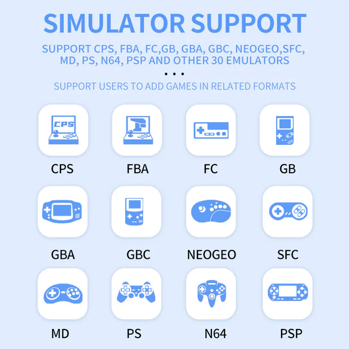 - Supports multiple game formats (CPS, FBA, FC, GB, GBA, GBC, NEOGEO, SFC, MD, PS, N64)